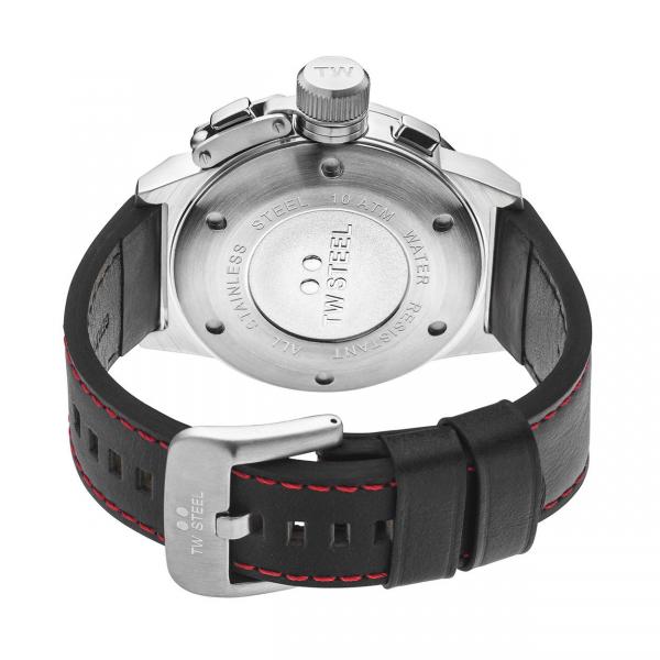 TW plieno klasikinis valgyklos Chronograph vyriškas laikrodis. Nerūdijančio plieno sidabrinis dėklas ir odinis juodas dirželis 23cm x 22mm. Baltos spalvos šviečiantys skaičiai ir indeksai. Atsparus vandeniui 10 ATM (plaukimas/snorkeliavimas).