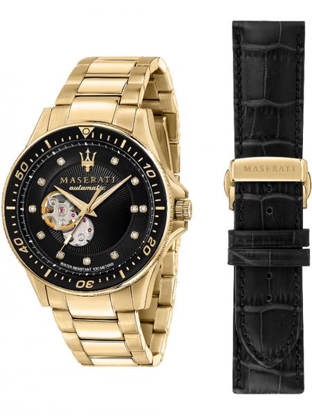 Maserati Sfida Automatic Movement vyriškas laikrodis. Nerūdijančio plieno dėklas ir dirželis 22cm x 22mm. Komplektuojamas su keičiamu odiniu laikrodžio dirželiu. Atsparumas vandeniui 10ATM (plaukimas/snorkeliavimas).